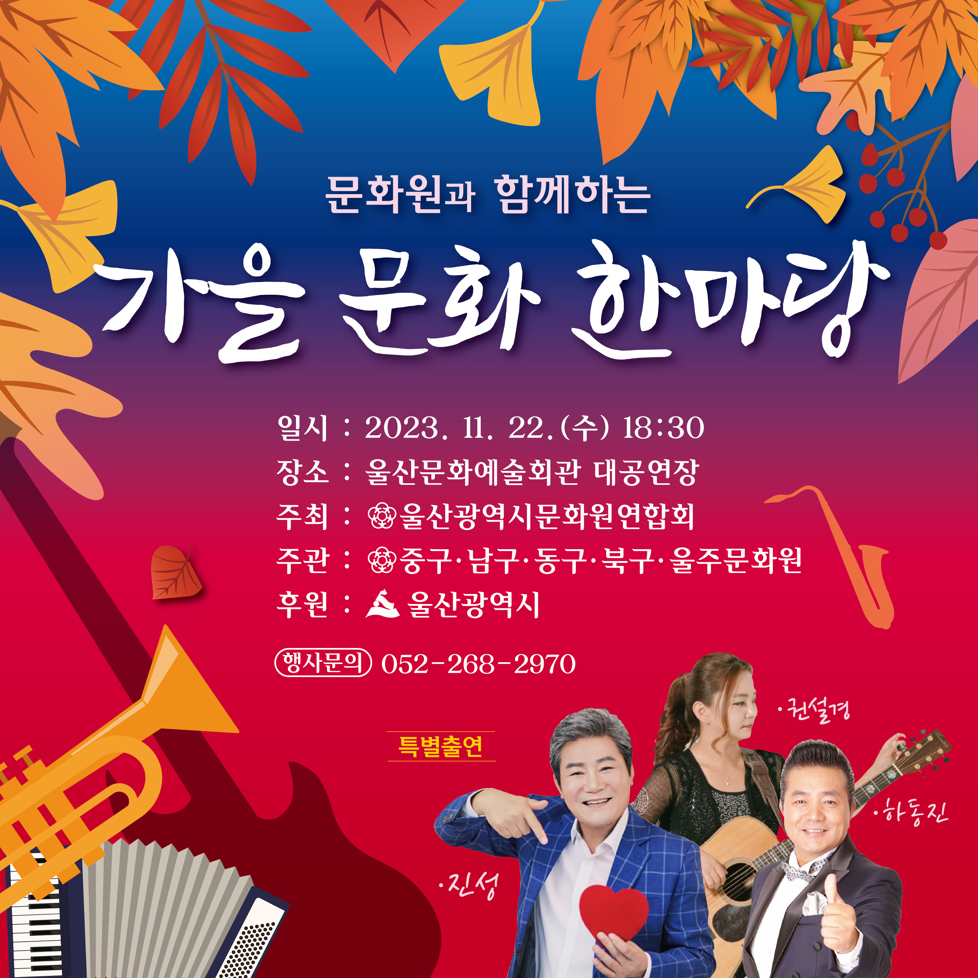문화원과 함께하는 가을 문화한마당 공지 페이지 정보 작성자 울산북구문화원 댓글 0건 조회 271회 작성일 23-11-14 14:27 목록 본문 문화원과 함께하는 가을 문화한마당일시: 11월22일(수)18시30분장소:울산문화예술회관 대공연장출연진: 진성, 하동진, 권설경 등티켓문의: 북구문화원(294-2222)북구에 150장 한정 배정되어 조기 소진될수 있습니다.북구문화원. 이전글제19회 충효백일장 결과발표일 공고 23.12.04 다음글제19회충효백일장 개최요강과 공모기간 연장 및 결과 발표일 공시 23.10.17 댓글 0 댓글목록 등록된 댓글이 없습니다.