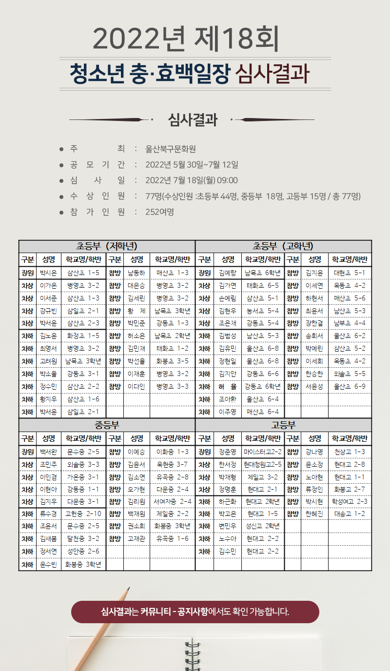 제18회 청소년 충효백일장 심사결과 페이지 정보 작성자 울산북구문화원 댓글 0건 조회 477회 작성일 22-07-18 16:02 목록 본문 제18회 청소년 충효백일장 심사결과 첨부파일 심사결과-제18회청소년백일장.hwp (21.5K) 113회 다운로드 | DATE : 2022-07-18 16:02:22 이전글2022에이팜 22.08.19 다음글2022년 제18회 충·효백일장 공모 및 대회요강 신청서 다운로드 22.07.01 댓글 0 댓글목록 등록된 댓글이 없습니다.